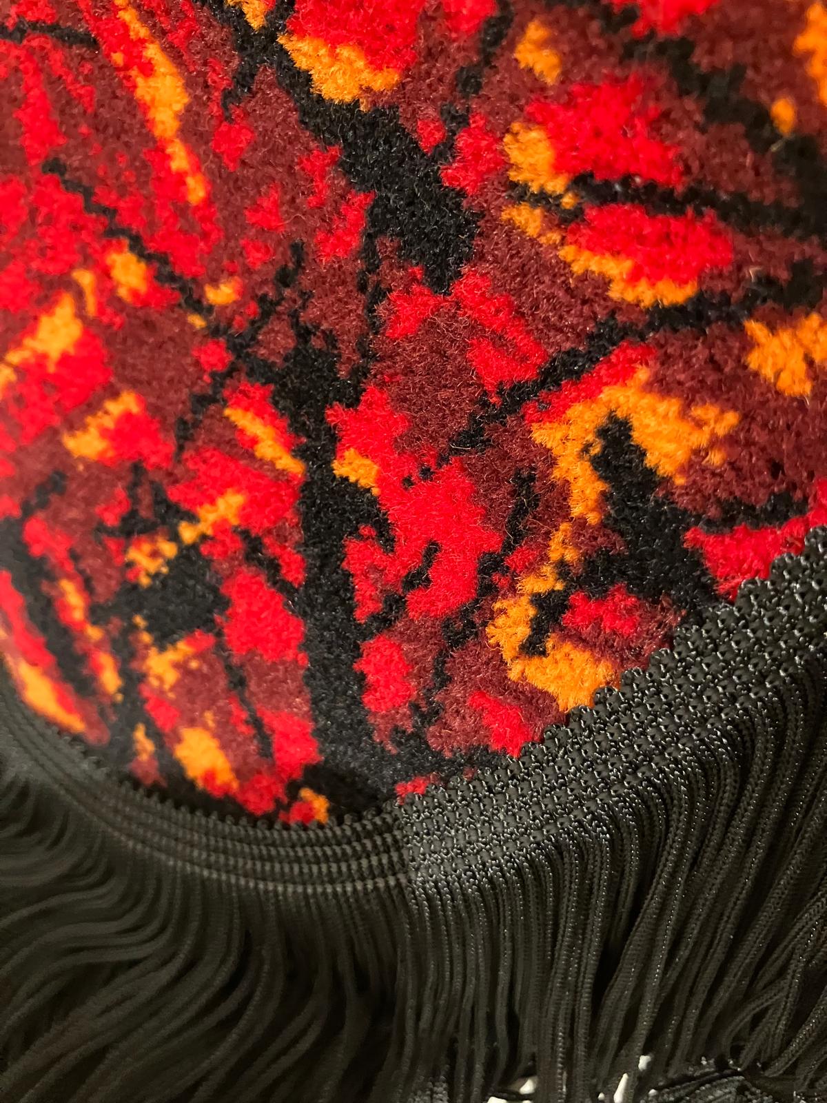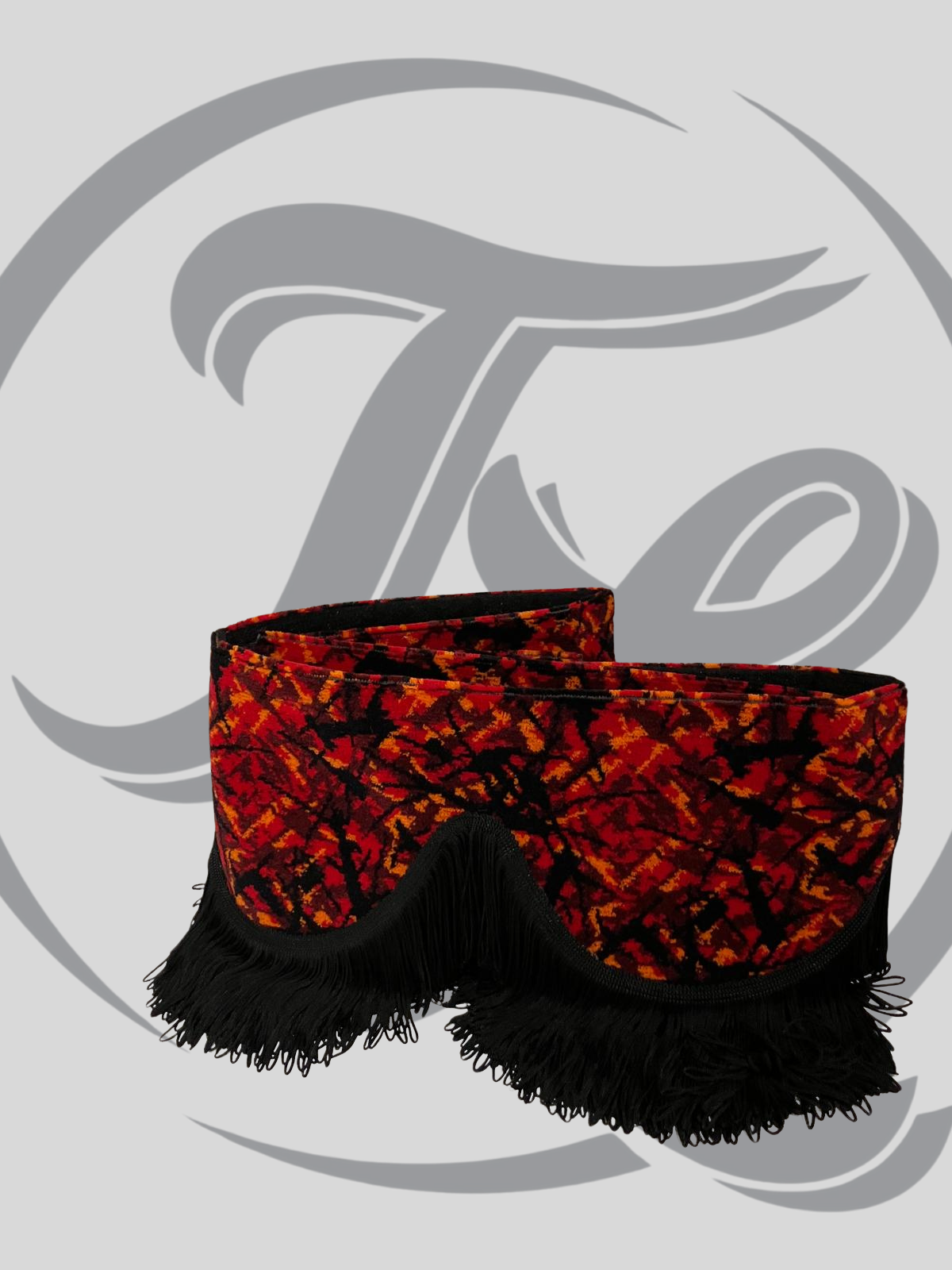 De raamband heeft rode pluche bogen met zwarte lange franjes.